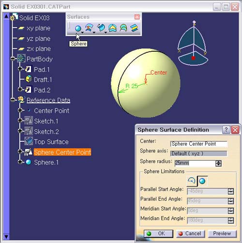 1. Sphere(±¸) »ý¼ºÇϱâ Sphere ¾ÆÀÌÄÜÀ» ¼±ÅÃÇÑ´Ù. Center : Sphere Center Point Sphere radius : 25mm Definitionâ ³»ÀÇ Sphere ±¸ ¾ÆÀÌÄÜÀ» ¼±ÅÃÇÑ´Ù.